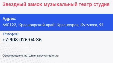 Звездный замок, музыкальный театр-студия по адресу 660122, Красноярский край, Красноярск, Кутузова, 91 в дальнейшем Организация, размещена в следующих категориях: