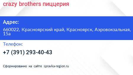 crazy brothers, пиццерия по адресу 660022, Красноярский край, Красноярск, Аэровокзальная, 15а в дальнейшем Организация, размещена в следующих категориях: