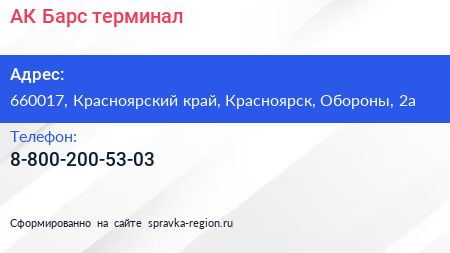 АК Барс, терминал по адресу 660017, Красноярский край, Красноярск, Обороны, 2а в дальнейшем Организация, размещена в следующих категориях: