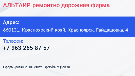 АЛЬТАИР, ремонтно-дорожная фирма по адресу 660131, Красноярский край, Красноярск, Гайдашовка, 4 в дальнейшем Организация, размещена в следующих категориях:
