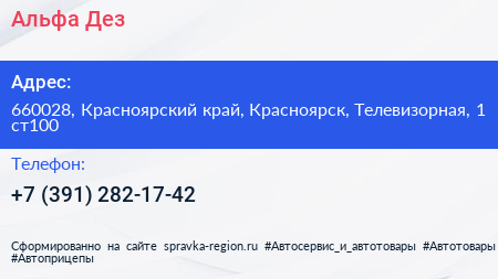 Альфа-Дез по адресу 660028, Красноярский край, Красноярск, Телевизорная, 1 ст100 в дальнейшем Организация, размещена в следующих категориях: