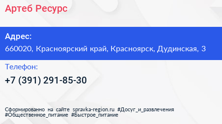 Артеб-Ресурс по адресу 660020, Красноярский край, Красноярск, Дудинская, 3 в дальнейшем Организация, размещена в следующих категориях:
