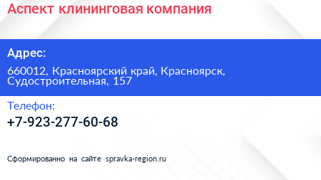Аспект, клининговая компания по адресу 660012, Красноярский край, Красноярск, Судостроительная, 157 в дальнейшем Организация, размещена в следующих категориях:
