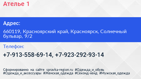 Ателье №1 по адресу 660119, Красноярский край, Красноярск, Солнечный бульвар, 9/2 в дальнейшем Организация, размещена в следующих категориях: