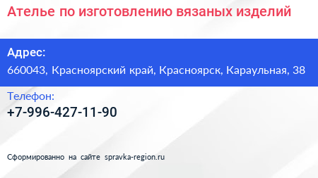 Ателье по изготовлению вязаных изделий по адресу 660043, Красноярский край, Красноярск, Караульная, 38 в дальнейшем Организация, размещена в следующих категориях: