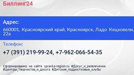 Биллинг24 по адресу 660001, Красноярский край, Красноярск, Ладо Кецховели, 22а в дальнейшем Организация, размещена в следующих категориях: