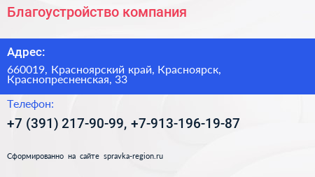 Благоустройство, компания по адресу 660019, Красноярский край, Красноярск, Краснопресненская, 33 в дальнейшем Организация, размещена в следующих категориях:
