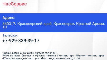 ЧасСервис по адресу 660017, Красноярский край, Красноярск, Красной Армии, 10 в дальнейшем Организация, размещена в следующих категориях: