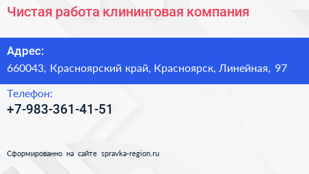 Чистая работа, клининговая компания по адресу 660043, Красноярский край, Красноярск, Линейная, 97 в дальнейшем Организация, размещена в следующих категориях: