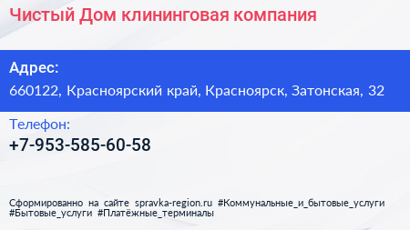Чистый Дом, клининговая компания по адресу 660122, Красноярский край, Красноярск, Затонская, 32 в дальнейшем Организация, размещена в следующих категориях: