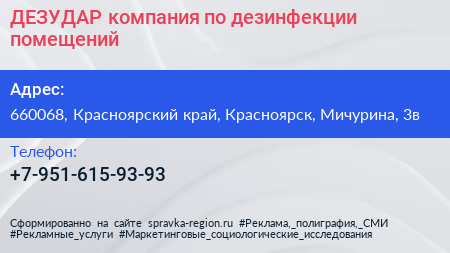 ДЕЗУДАР, компания по дезинфекции помещений по адресу 660068, Красноярский край, Красноярск, Мичурина, 3в в дальнейшем Организация, размещена в следующих категориях:
