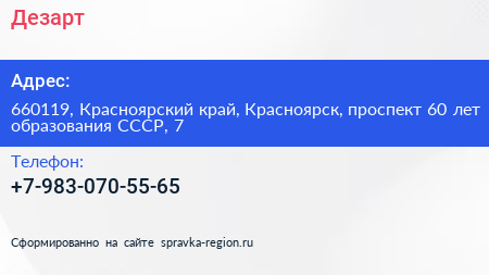Дезарт по адресу 660119, Красноярский край, Красноярск, проспект 60 лет образования СССР, 7 в дальнейшем Организация, размещена в следующих категориях: