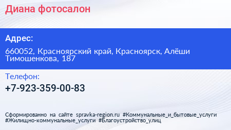 Диана, фотосалон по адресу 660052, Красноярский край, Красноярск, Алёши Тимошенкова, 187 в дальнейшем Организация, размещена в следующих категориях: