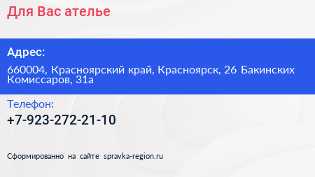 Для Вас, ателье по адресу 660004, Красноярский край, Красноярск, 26 Бакинских Комиссаров, 31а в дальнейшем Организация, размещена в следующих категориях: