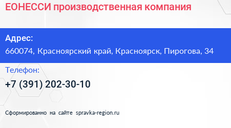 ЕОНЕССИ, производственная компания по адресу 660074, Красноярский край, Красноярск, Пирогова, 34 в дальнейшем Организация, размещена в следующих категориях: