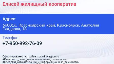 Елисей, жилищный кооператив по адресу 660016, Красноярский край, Красноярск, Анатолия Гладкова, 18 в дальнейшем Организация, размещена в следующих категориях:
