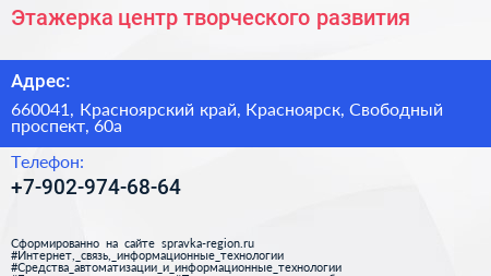 Этажерка, центр творческого развития по адресу 660041, Красноярский край, Красноярск, Свободный проспект, 60а в дальнейшем Организация, размещена в следующих категориях: