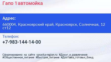 Гапо-1, автомойка по адресу 660004, Красноярский край, Красноярск, Солнечная, 12 ст12 в дальнейшем Организация, размещена в следующих категориях: