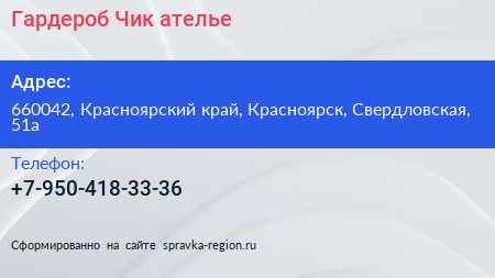 Гардероб Чик, ателье по адресу 660042, Красноярский край, Красноярск, Свердловская, 51а в дальнейшем Организация, размещена в следующих категориях: