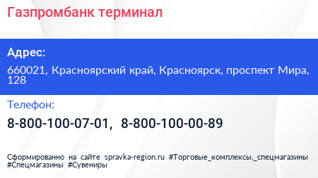 Газпромбанк, терминал по адресу 660021, Красноярский край, Красноярск, проспект Мира, 128 в дальнейшем Организация, размещена в следующих категориях:
