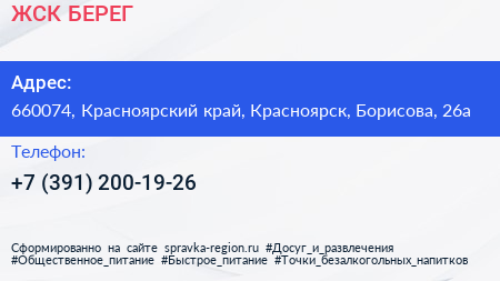 ЖСК БЕРЕГ по адресу 660074, Красноярский край, Красноярск, Борисова, 26а в дальнейшем Организация, размещена в следующих категориях: