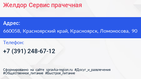 Желдор-Сервис, прачечная по адресу 660058, Красноярский край, Красноярск, Ломоносова, 90 в дальнейшем Организация, размещена в следующих категориях: