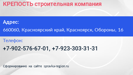 КРЕПОСТЬ, строительная компания по адресу 660060, Красноярский край, Красноярск, Обороны, 16 в дальнейшем Организация, размещена в следующих категориях: