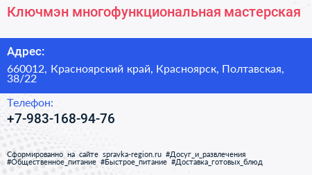 Ключмэн, многофункциональная мастерская по адресу 660012, Красноярский край, Красноярск, Полтавская, 38/22 в дальнейшем Организация, размещена в следующих категориях:
