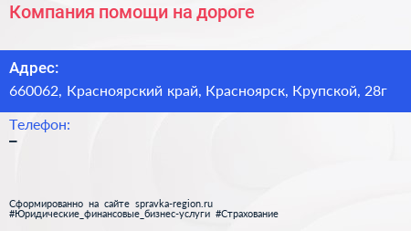 Компания помощи на дороге по адресу 660062, Красноярский край, Красноярск, Крупской, 28г в дальнейшем Организация, размещена в следующих категориях: