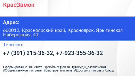 КрасЗамок по адресу 660012, Красноярский край, Красноярск, Ярыгинская Набережная, 41 в дальнейшем Организация, размещена в следующих категориях: