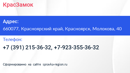 КрасЗамок по адресу 660077, Красноярский край, Красноярск, Молокова, 40 в дальнейшем Организация, размещена в следующих категориях: