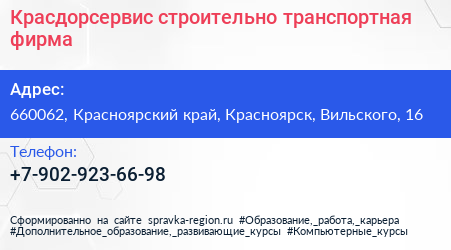 Красдорсервис, строительно-транспортная фирма по адресу 660062, Красноярский край, Красноярск, Вильского, 16 в дальнейшем Организация, размещена в следующих категориях: