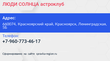 ЛЮДИ СОЛНЦА, астроклуб по адресу 660074, Красноярский край, Красноярск, Ленинградская, 5Б в дальнейшем Организация, размещена в следующих категориях: