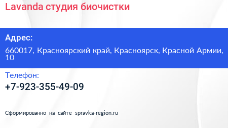 Lavanda, студия биочистки по адресу 660017, Красноярский край, Красноярск, Красной Армии, 10 в дальнейшем Организация, размещена в следующих категориях: