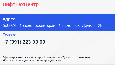 ЛифтТехЦентр по адресу 660074, Красноярский край, Красноярск, Дачная, 28 в дальнейшем Организация, размещена в следующих категориях: