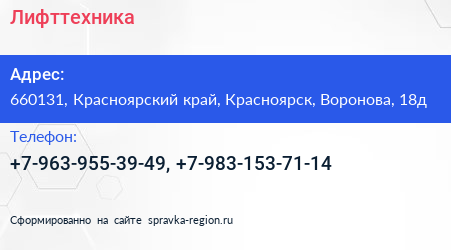 Лифттехника по адресу 660131, Красноярский край, Красноярск, Воронова, 18д в дальнейшем Организация, размещена в следующих категориях: