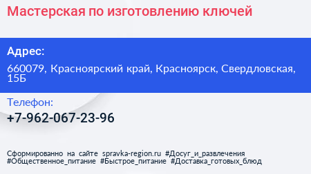 Мастерская по изготовлению ключей по адресу 660079, Красноярский край, Красноярск, Свердловская, 15Б в дальнейшем Организация, размещена в следующих категориях:
