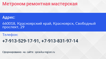 Метроном, ремонтная мастерская по адресу 660018, Красноярский край, Красноярск, Свободный проспект, 29 в дальнейшем Организация, размещена в следующих категориях: