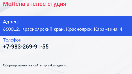 МоЛена, ателье-студия по адресу 660012, Красноярский край, Красноярск, Карамзина, 4 в дальнейшем Организация, размещена в следующих категориях: