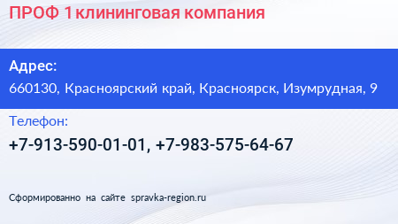 ПРОФ-1, клининговая компания по адресу 660130, Красноярский край, Красноярск, Изумрудная, 9 в дальнейшем Организация, размещена в следующих категориях: