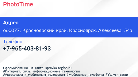 PhotoTime по адресу 660077, Красноярский край, Красноярск, Алексеева, 54а в дальнейшем Организация, размещена в следующих категориях: