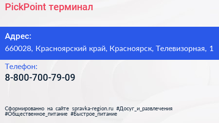PickPoint, терминал по адресу 660028, Красноярский край, Красноярск, Телевизорная, 1 в дальнейшем Организация, размещена в следующих категориях: