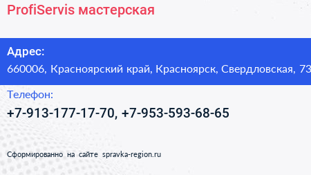ProfiServis, мастерская по адресу 660006, Красноярский край, Красноярск, Свердловская, 73 в дальнейшем Организация, размещена в следующих категориях: