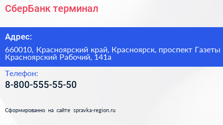 СберБанк, терминал по адресу 660010, Красноярский край, Красноярск, проспект Газеты Красноярский Рабочий, 141а в дальнейшем Организация, размещена в следующих категориях:
