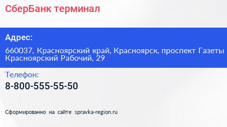 СберБанк, терминал по адресу 660037, Красноярский край, Красноярск, проспект Газеты Красноярский Рабочий, 29 в дальнейшем Организация, размещена в следующих категориях:
