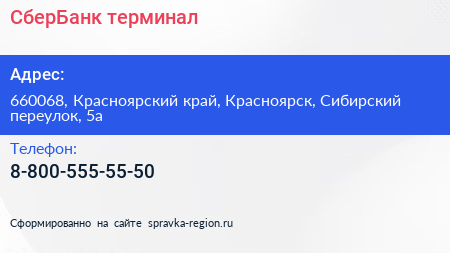 СберБанк, терминал по адресу 660068, Красноярский край, Красноярск, Сибирский переулок, 5а в дальнейшем Организация, размещена в следующих категориях: