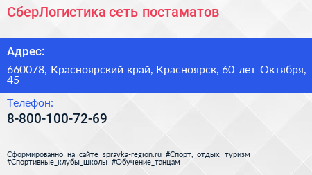 СберЛогистика, сеть постаматов по адресу 660078, Красноярский край, Красноярск, 60 лет Октября, 45 в дальнейшем Организация, размещена в следующих категориях: