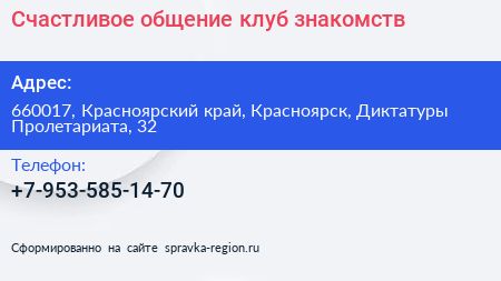 Счастливое общение, клуб знакомств по адресу 660017, Красноярский край, Красноярск, Диктатуры Пролетариата, 32 в дальнейшем Организация, размещена в следующих категориях: