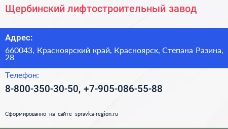 Щербинский лифтостроительный завод по адресу 660043, Красноярский край, Красноярск, Степана Разина, 28 в дальнейшем Организация, размещена в следующих категориях: