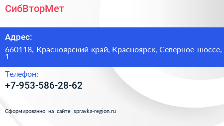 СибВторМет по адресу 660118, Красноярский край, Красноярск, Северное шоссе, 1 в дальнейшем Организация, размещена в следующих категориях: